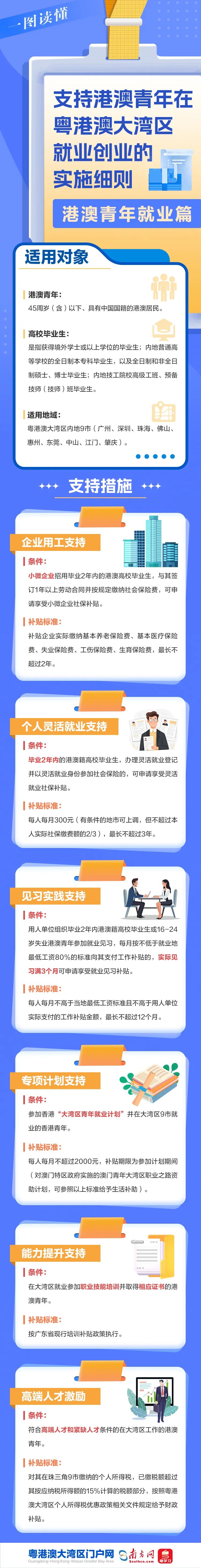近日,《支持港澳青年在粤港澳大湾区就业创业的实施细则》正式出台。该政策旨在通过 “真金白银”的补贴与实实在在的服务,切实降低港澳青年在内地发展的门槛与成本。港澳青年们,这份政策图解为你盘点了在大湾区大展宏图的多种“着数”,速来查收!