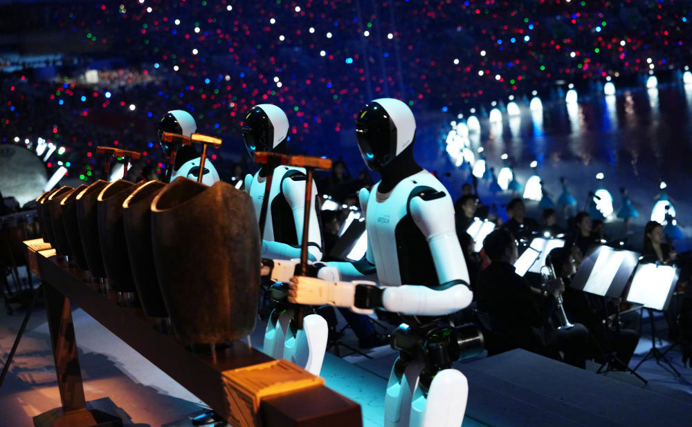 文体展演第一章《同根同源》中,象征粤港澳三地的三个机器人整齐划一地“敲响”铜句鑃仿制品,舞台上响起《彩云追月》的动人音符。