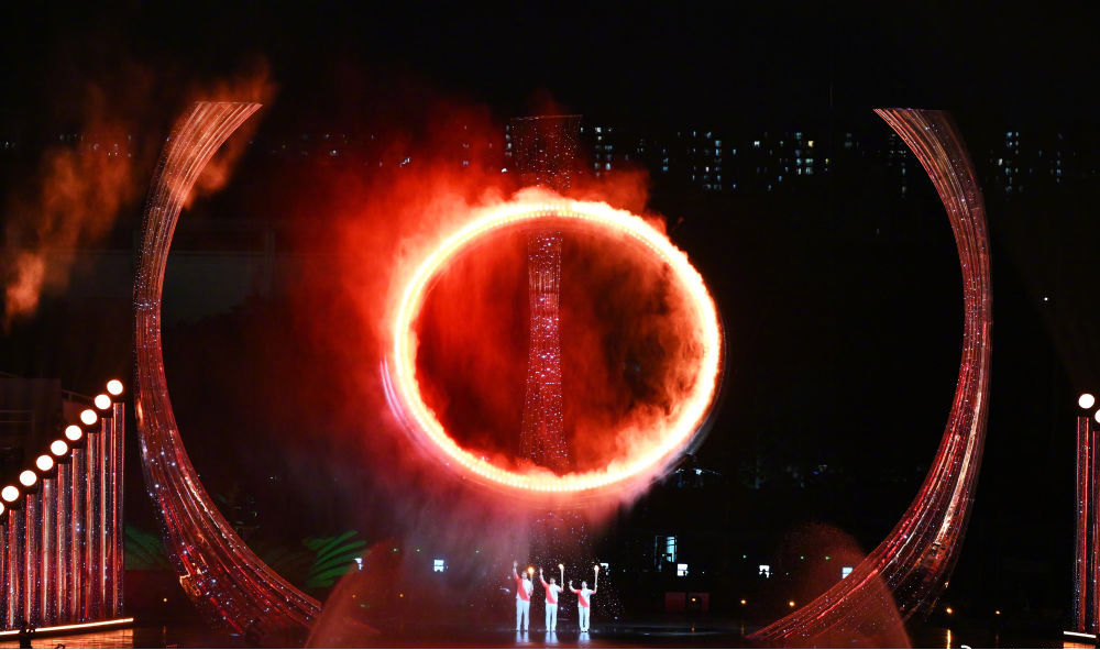 最后一棒点火火炬手来自粤港澳三地,他们是男子100米亚洲纪录保持者苏炳添,第32、33届奥运会男子花剑金牌得主、香港运动员张家朗,第19届亚运会武术长拳金牌获得者、澳门运动员李祎。引天之光,燃海之火,全运圣火,从浩瀚深海到岭南大地,粤港澳三地火炬手共同点燃十五运会主火炬!