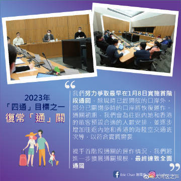 香港特区政府政务司司长陈国基今天(1日)在其社交网站发文称,“通关事务协调组”正分秒必争地拟订稳妥方案以达至逐步、有序、全面“通关”。特区政府同时与中央、粤深政府相关单位密切联系,争取最早在1月8日实施首阶段“通关”。除了现时已经开放的口岸外,部分已关闭多时的口岸将会恢复运作。