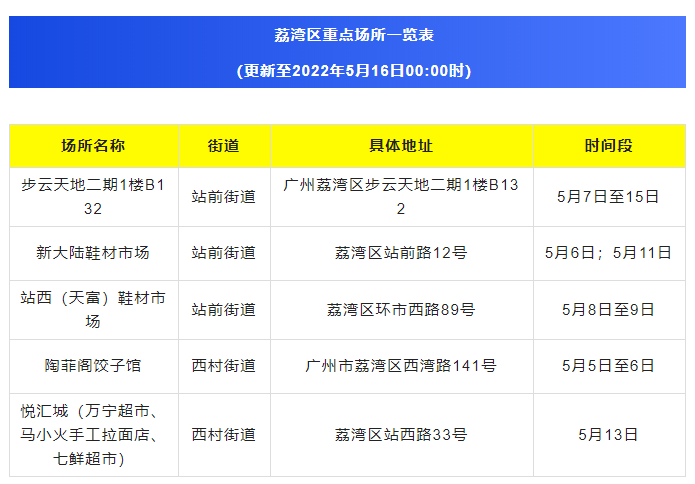 南方网讯 5月16日,广州荔湾疾控发布提醒,请在相关时段到过步云天地二期1楼B132、新大陆鞋材市场、站西(天富)鞋材市场、陶菲阁饺子馆、悦汇城(万宁超市、马小火手工拉面店、七鲜超市)等站前街和西村街重点场所的人员请立即报备并进行核酸检测。具体通知如下: