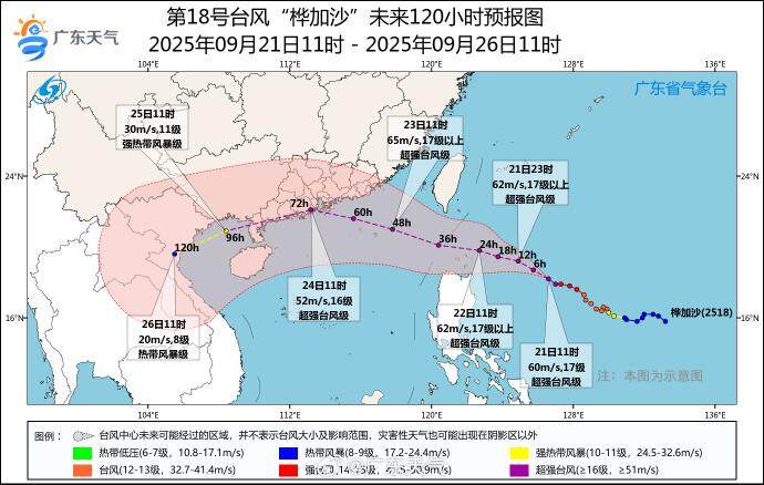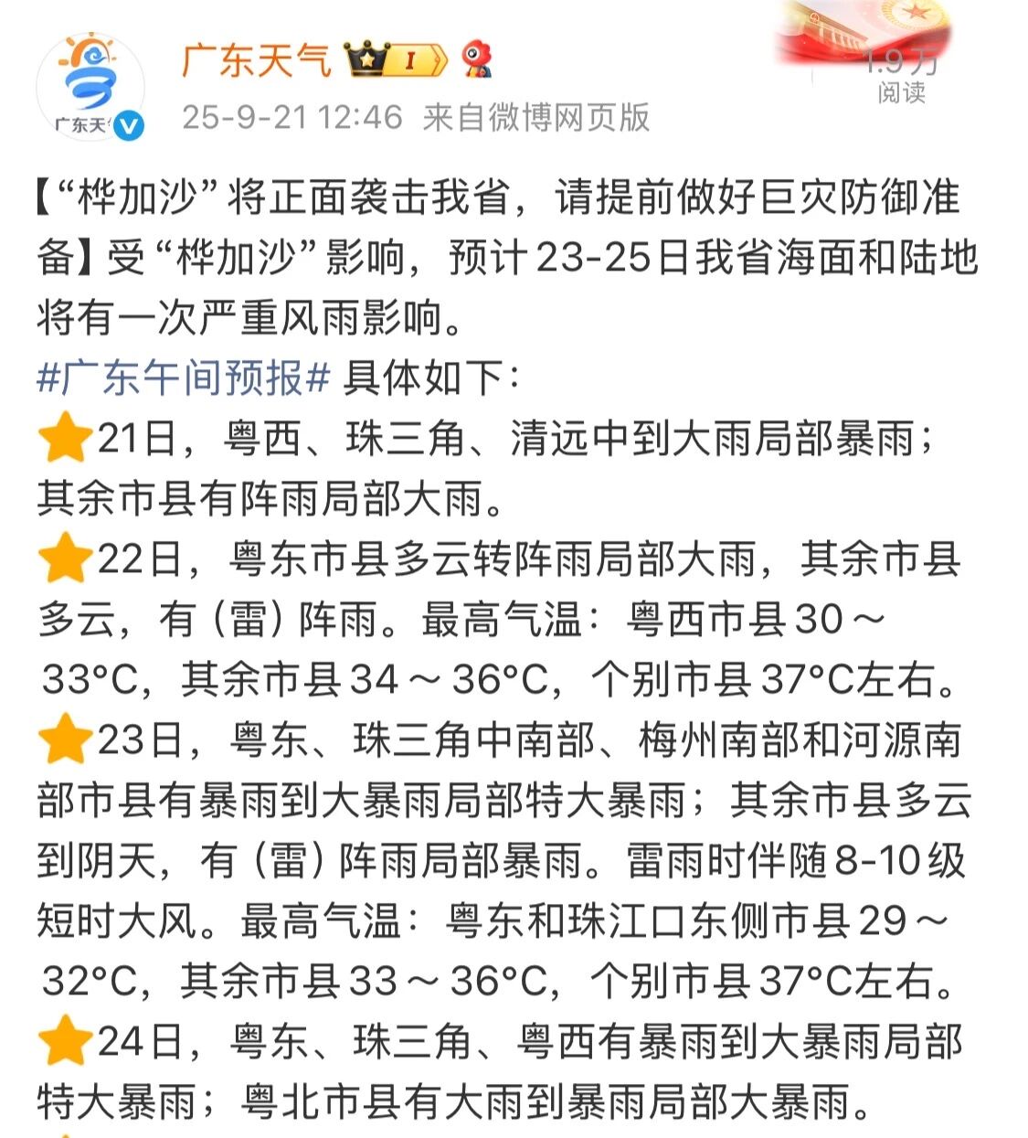 广东省气象局9月21日发布提醒:“桦加沙”强度强、风圈范围大,将给南海中北部海面、广东海面及中南部市县带来严重风雨浪潮的影响,需提前做好巨灾防御准备,特别是在南海中北部海域所有各类船只和人员需尽快回港避风;已回港避风的船只注意做好安全管理。广东各地需注意防御强降水导致的城市内涝、山体滑坡、山洪、泥石流、中小河流涨水等灾害。注意防御台风外围出现的局地强雷雨、短时大风、龙卷等强对流天气。除了关注风雨,预计22日至23日,广东大部分市县高温炎热,需注意防暑防晒。