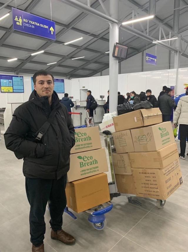 第一次,他从家乡乌兹别克斯坦古利斯坦出发,搭车前往120公里的首都塔什干,在塔什干搭乘飞机到俄罗斯莫斯科,再从莫斯科转机到中国北京,在北京首都国际机场找到驻点快递公司把1.2万个口罩寄到广州后,随即登上返回乌兹别克斯坦的飞机。全程共花了近3天的时间。