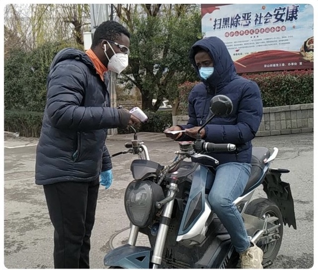 自2月起,在温州市瓯海区茶山街道防疫检查卡点,每天中午到傍晚时分,都可以看到这位特殊非洲志愿者。他手中拿着测温仪,为每一位进出社区的人员进行体温检测,并及时向居住在这里的留学生解释最新的防疫政策和措施。