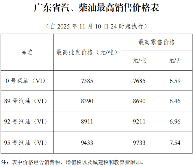 根据国家成品油价格形成机制,结合近一段时期国际市场油价变化情况,国家发展改革委决定自2025年11月10日24时起上调国内成品油价格,即在现行价格的基础上,我省汽、柴油价格每吨分别上调125元和120元。调整后,我省成品油最高销售价格见下表。