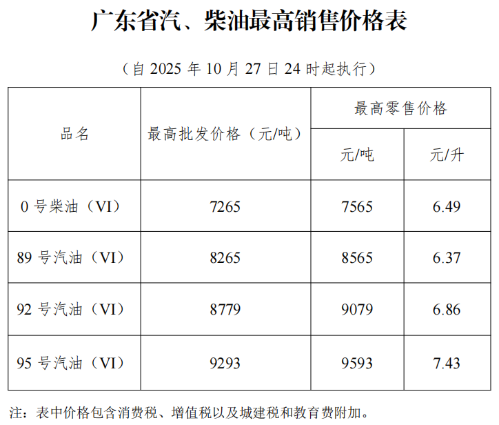 根据国家成品油价格形成机制,结合近一段时期国际市场油价变化情况,国家发展改革委决定自2025年10月27日24时起下调国内成品油价格,即在现行价格的基础上,我省汽、柴油价格每吨分别下调265元和255元。调整后,我省成品油最高销售价格见下表。