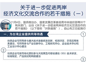 11月4日,国务院台办、国家发展改革委经商中央组织部等20个有关部门,出台《关于进一步促进两岸经济文化交流合作的若干措施》,自公布之日起施行。