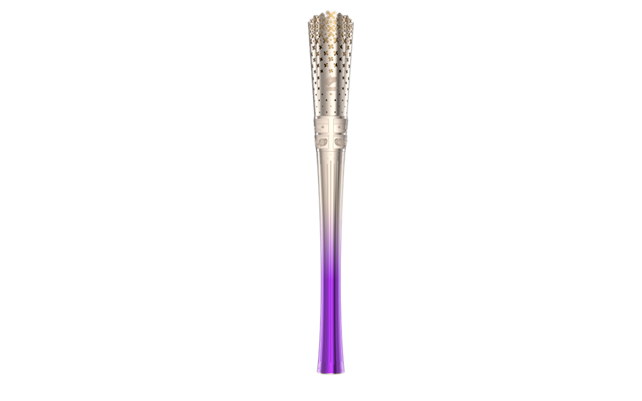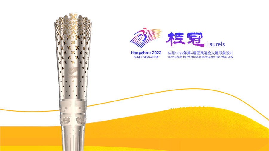 “桂冠”通体月桂黄与虹韵紫交相辉映,整体高756毫米,净重1160克,与亚运火炬“薪火”形成一种相互呼应关系。