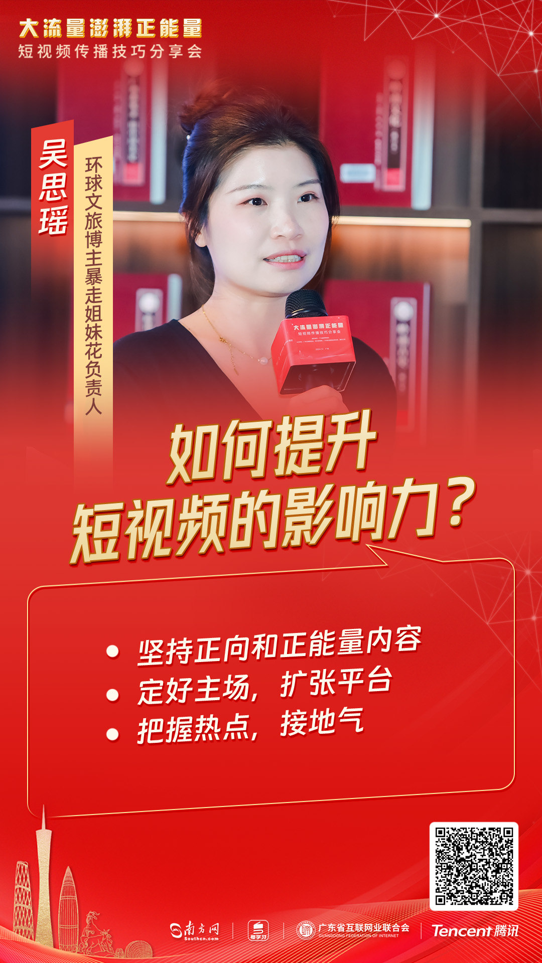 12月2日,在广东省委网信办的指导下,由广州市委网信办、南方新闻网、广东省互联网业联合会、腾讯公司主办的“大流量澎湃正能量”短视频传播技巧分享会在广州举办。环球文旅博主暴走姐妹花负责人吴思瑶为大家分享《小视频看大世界》。
