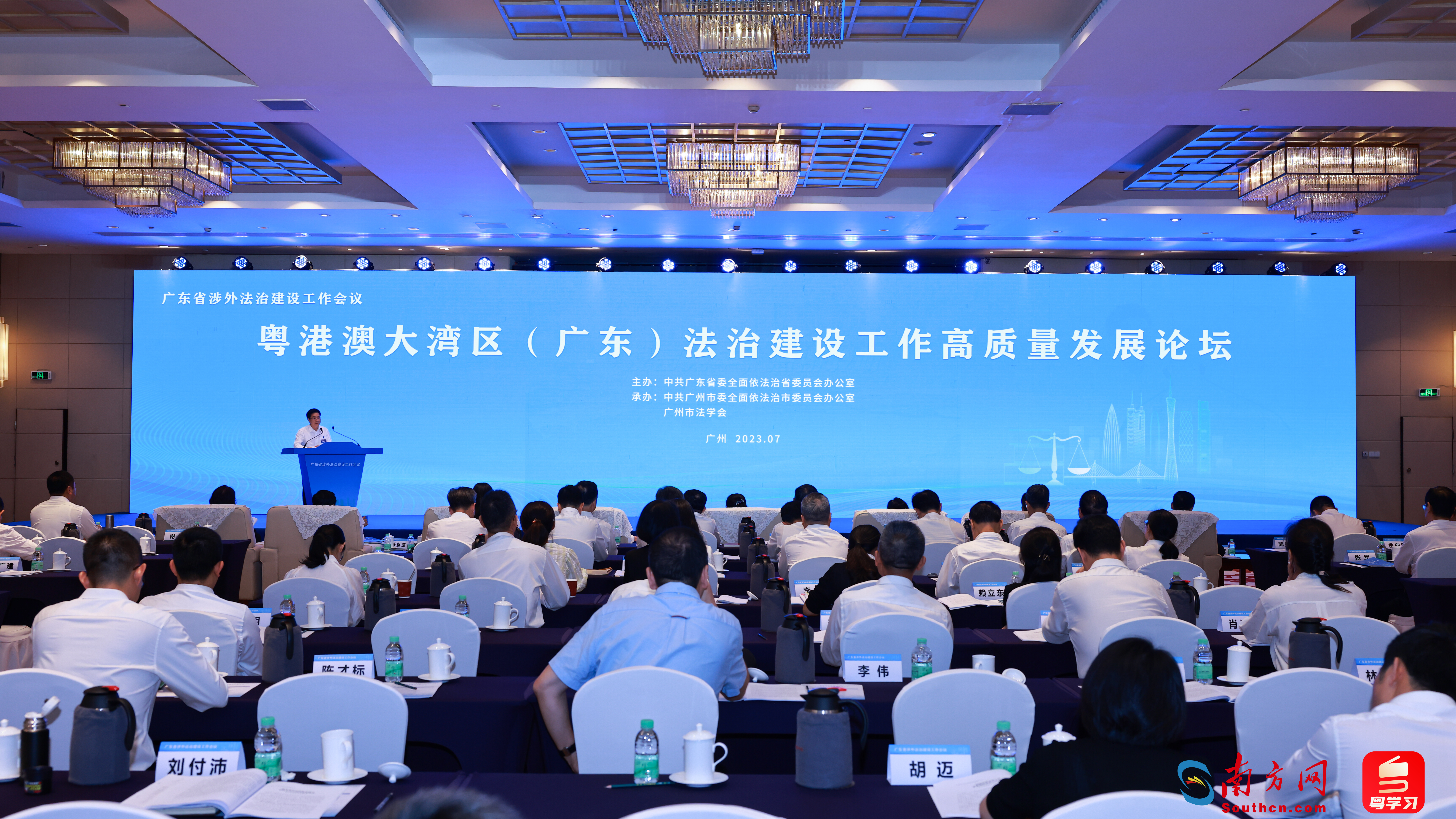 南方网讯(记者/李润芳 通讯员/粤政宣)7月19日下午,粤港澳大湾区(广东)法治建设工作高质量发展论坛在广州举办。本次论坛以“涉外法治保障粤港澳大湾区高质量发展”为主题,是广东省委依法治省办举办的“广东省涉外法治建设工作会议”中6个平行专业论坛之一,由广州市委依法治市办、广州市法学会承办。中央政府驻港联络办法律工作部、中央政府驻澳联络办法律工作部,广东省委政法委,各地级以上市党委政法委、依法治市办及省涉外法律服务工作联席会议成员单位有关负责同志出席论坛。广东省涉外法治建设工作表现突出集体和个人代表,粤港澳大湾区执业律师代表,粤港澳地区高校法学专家,涉外法律专家代表等嘉宾参加论坛。