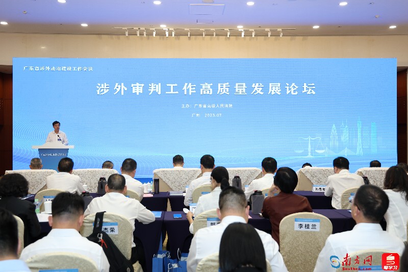 南方网讯(记者/杨政芳 通讯员/粤政宣)7月19日下午,广东涉外审判工作高质量发展论坛在广州举办。本次论坛是由广东省委依法治省办举办的“广东省涉外法治建设工作会议”中6个平行专业论坛之一,由广东省高级人民法院主办。论坛以“推动司法规则衔接 打造跨境纠纷解决优选地”为主题。最高法院有关部门负责同志,省委政法委、广东高院有关领导出席论坛。港澳专家学者和调解员代表,省司法厅、公安厅、部分地级以上市委依法治市办、司法局相关领导,大湾区内地九市中级人民法院、广州海事法院、广州知识产权法院,以及越秀、南沙、前海、横琴法院相关负责同志参加论坛。