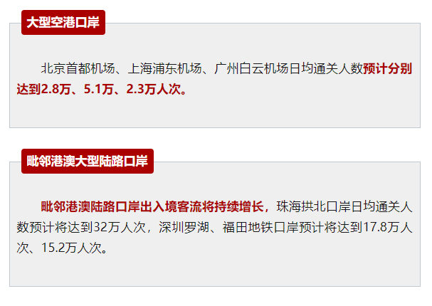 预计客流高峰主要集中在6月22日、6月23日。大型国际空港口岸出入境客流稳步恢复,北京首都机场、上海浦东机场、广州白云机场日均通关人数预计分别达到2.8万、5.1万、2.3万人次。毗邻港澳陆路口岸出入境客流将持续增长,珠海拱北口岸日均通关人数预计将达到32万人次,深圳罗湖、福田地铁口岸预计将达到17.8万人次、15.2万人次。