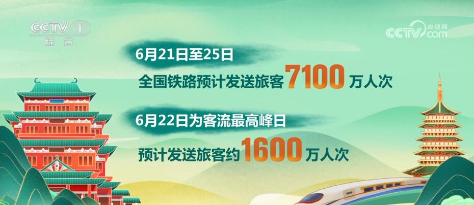 为期5天的铁路端午小长假运输今日启动。6月21日至25日,全国铁路预计发送旅客7100万人次,6月22日为客流最高峰日,预计发送旅客约1600万人次。6月21日起,热门线路和车站增开列车,确保旅客顺利出行。