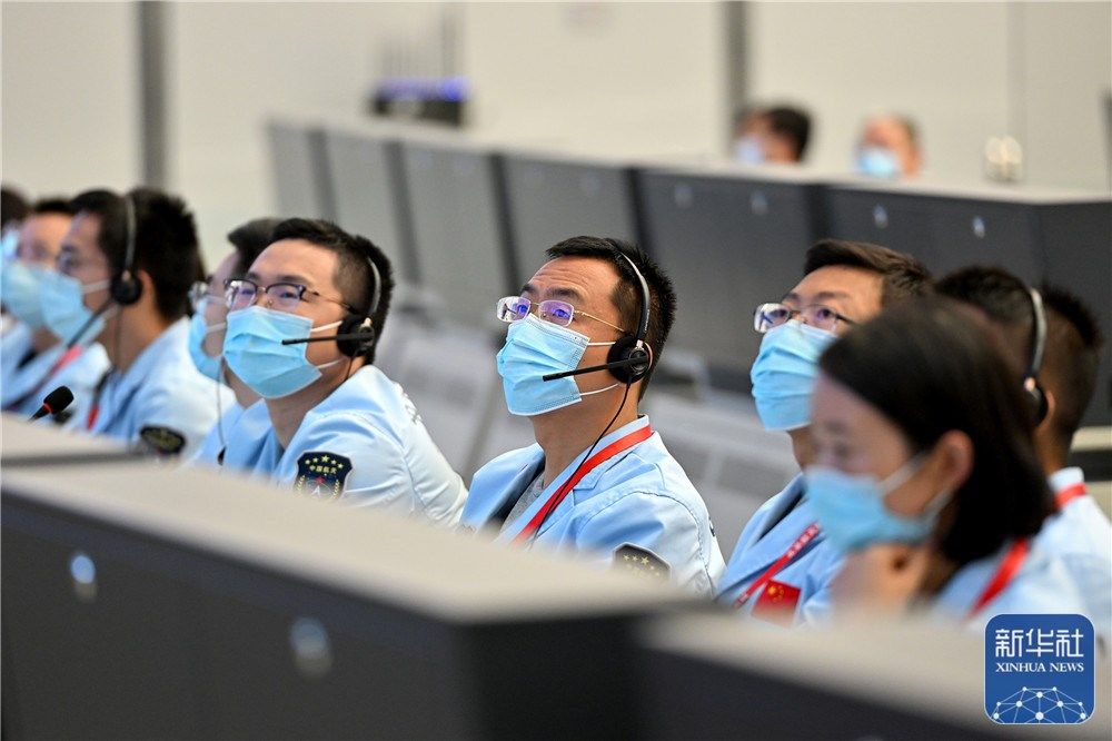 6月5日在北京航天飞行控制中心拍摄的神舟十四号载人飞船与天和核心舱自主快速交会对接的画面。新华社记者 李鑫 摄