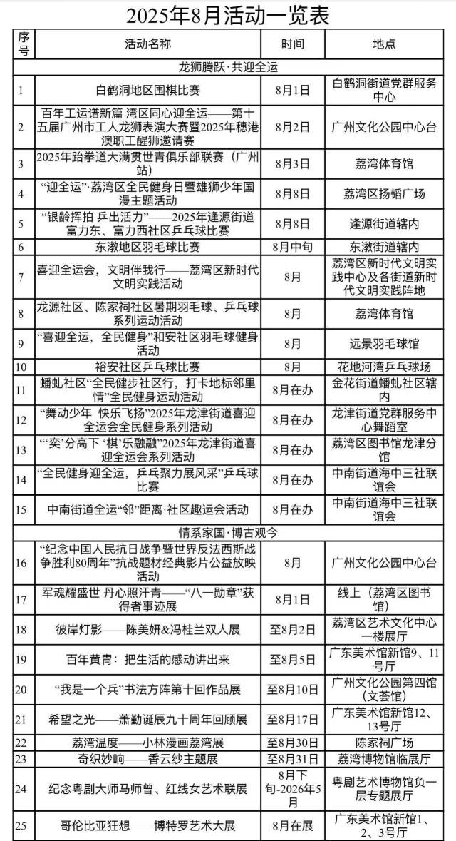 龙狮腾跃迎全运,对月穿针乞巧智。暑期虽已过半,但盛夏的荔湾热情不减!八月不仅有穿针引线的民俗巧韵、锣鼓铿锵的醒狮激情,更激荡着血脉相连的家国情怀与源远流长的文脉华章。期待市民游客朋友们走进荔湾,逛市集、赏非遗、看展演、学巧艺,在传统与潮流的碰撞中共享活力盛夏的精彩纷呈!