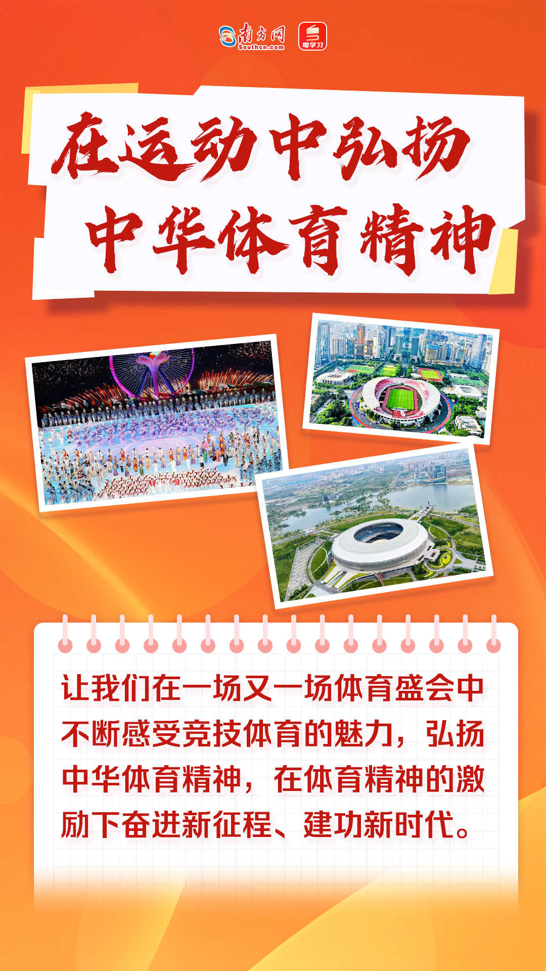 让我们在一场又一场体育盛会中不断感受竞技体育的魅力,弘扬中华体育精神,在体育精神的激励下奋进新征程、建功新时代。