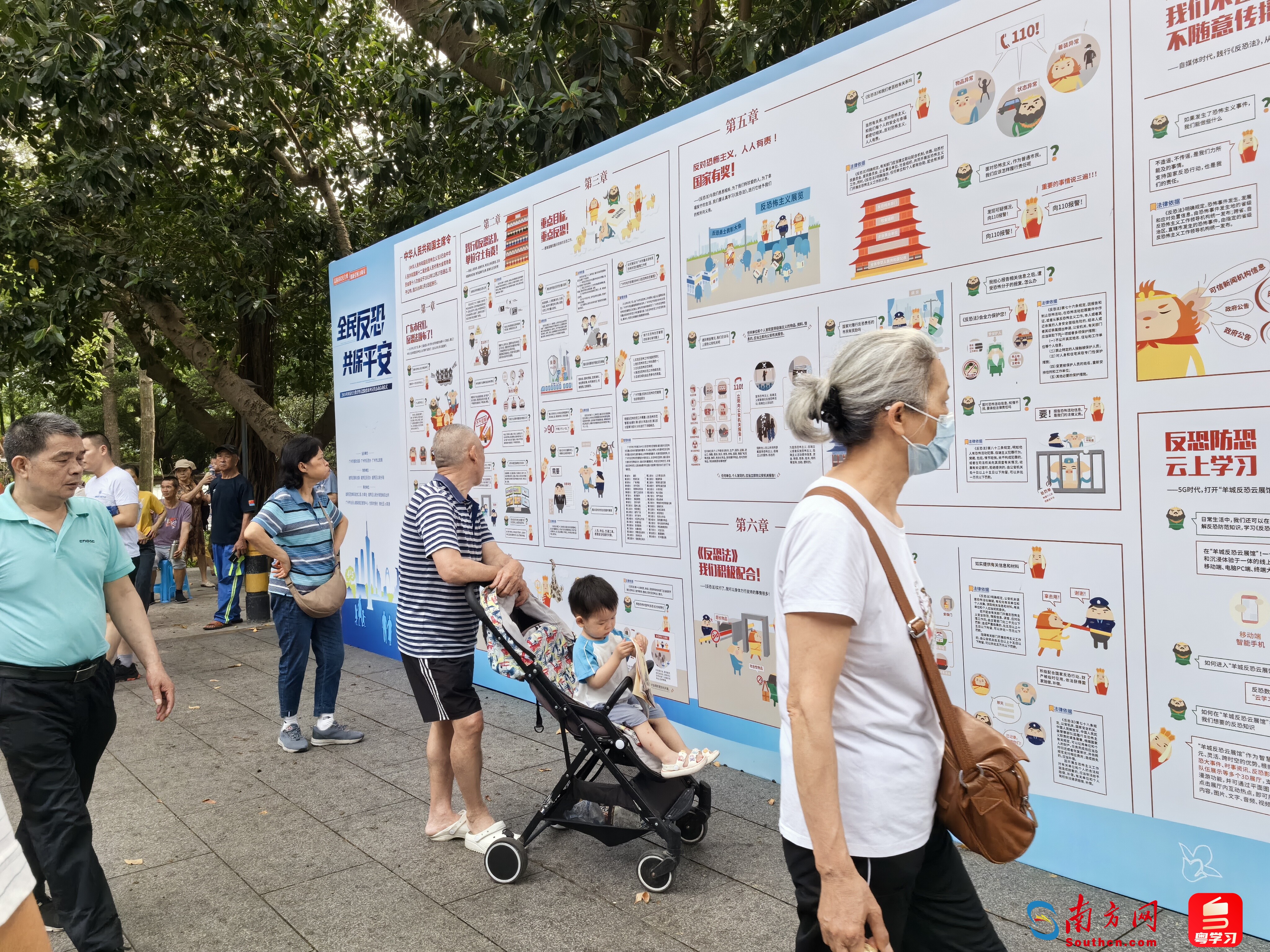 现场市民积极参与社区安全倡议、民族服务管理政策解读、社区安全建设互动问答等小活动。“活动丰富多彩,展板内容详细生动,了解到那么多反恐知识,也了解到广州反恐力量多么强大,我觉得很安心。”现场市民告诉记者,她每天都会过来麓湖公园运动,今天公园格外热闹,便停下脚步仔细阅读展板内容。