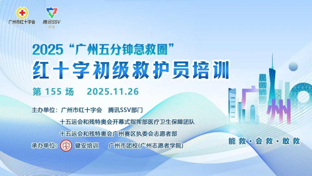 11月26日,由广州市红十字会、腾讯SSV部门、十五运会和残特奥会开幕式指挥部医疗卫生保障团队、十五运会和残特奥会广州赛区执委会志愿者部主办,“广州五分钟急救圈”应急救护培训项目第155期培训在广州市团校(广州志愿者学院)开展,73名残特奥会志愿者参与。