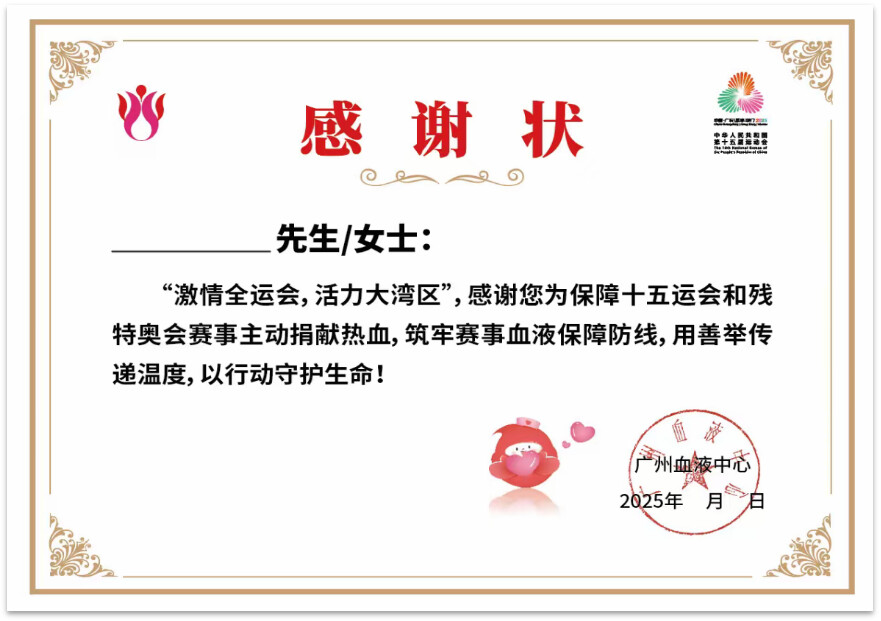 热血福利第一重:“十五运会”专属无偿献血感谢状