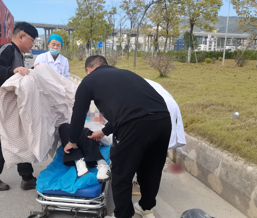 在救护车抵达后,黄晓祥向医护人员说明伤者受伤情况及应急处置情况,协助把伤者抬上救护车,并随车一同前往医院进行下一步治疗。