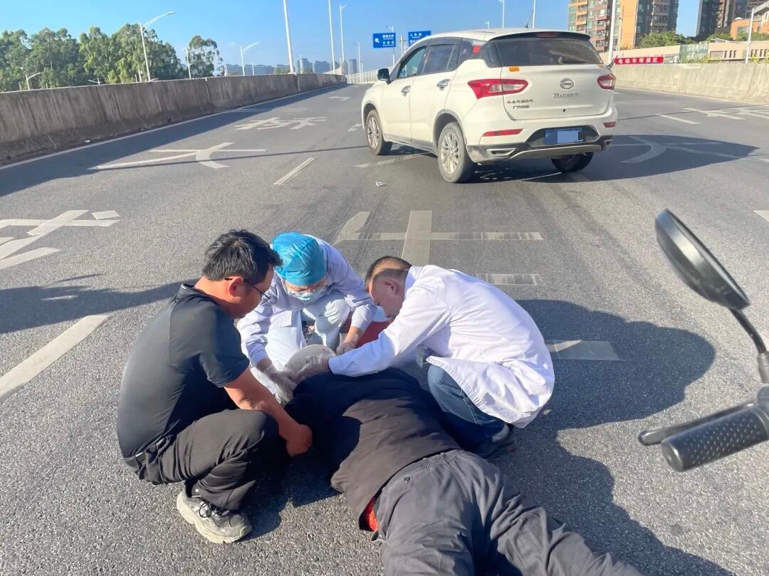 “师傅,你试着深呼吸,告诉我哪里不舒服?”在等待救护车的18分钟里,吕俊伟始终半蹲在伤者身边,保持沟通、密切观察伤情,用专业的急救知识和耐心的陪伴,给伤者注入强心剂。当120急救车呼啸而至,吕俊伟立刻与医护人员对接,详细说明伤者情况、自己的判断及处置措施,随后协助医护人员小心翼翼地将伤者转移至救护车上。确认伤者安全转运后,他默默收拾好现场,悄无声息地驾车离开。