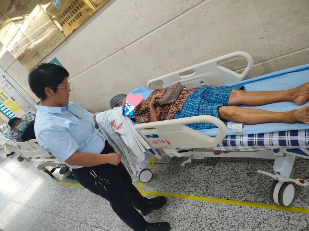 当120医生询问谁陪同就医时,邝彩红毫不犹豫:“家属都在广州,我可以陪同!”在医院,她全程陪伴老人。医生处理伤口时,她紧紧搂住发抖的老人,轻声聊天分散其注意力。老人手腕骨折、手臂两处创伤需要缝针,邝彩红始终守在身边。在观察室里,老人焦急地要回家照顾孙子,邝彩红耐心安抚,陪她等待从广州赶回来的女儿。