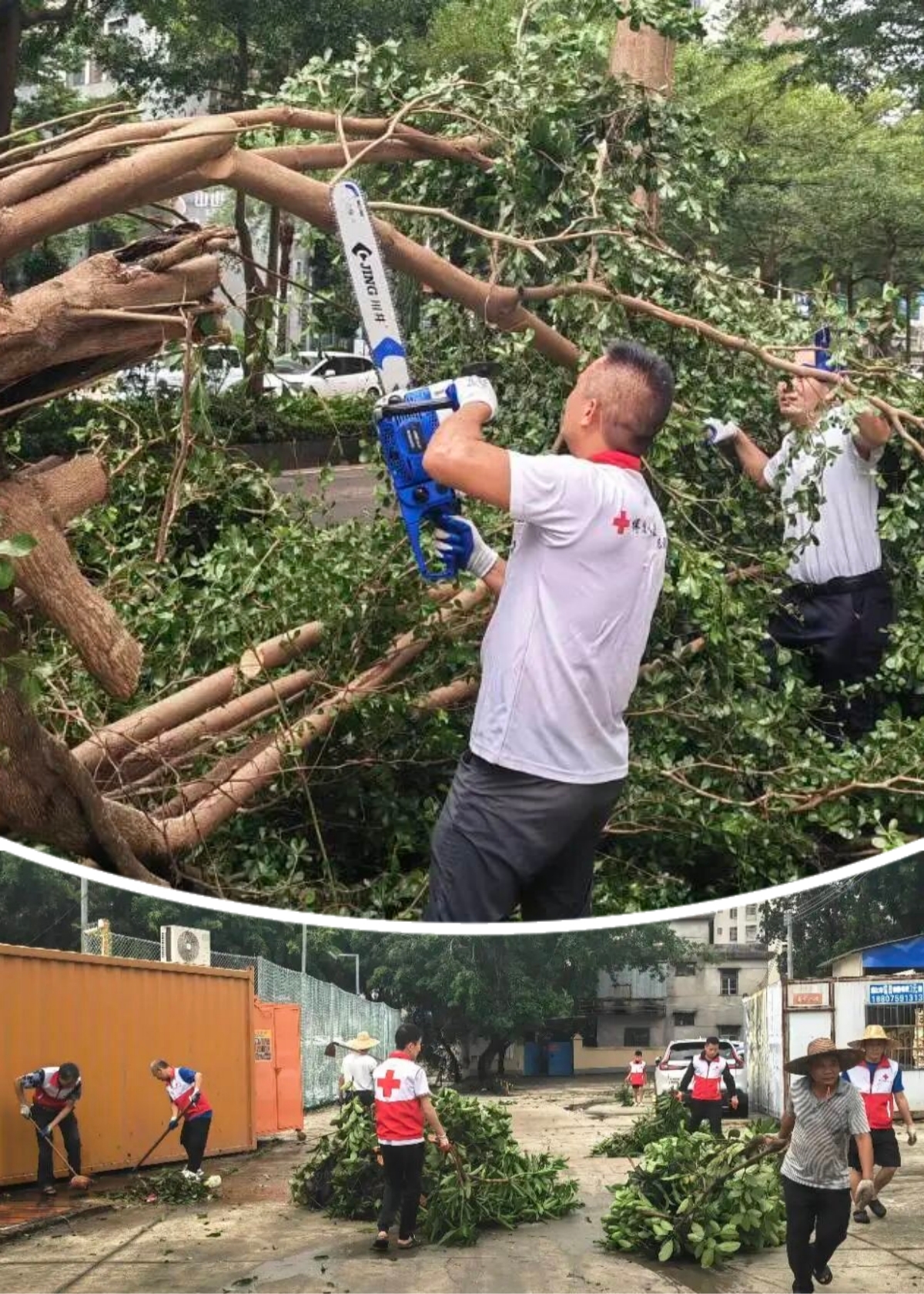 10月6日早晨,台风“麦德姆”影响逐渐减弱,湛江市红十字会立即召集40余名工作人员、志愿者,身着红马甲前往赤坎区百姓村、京基社区两个受灾区域开展救援。志愿者们手持油锯、铁锹、扫把等工具,分工协作切割断木、搬运碎石、清理树枝、清扫垃圾、清运杂物,打通受阻的道路,保障车辆正常通行。