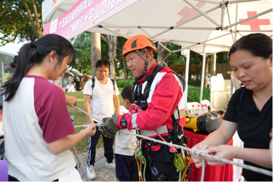 高空逃生、消防逃生等特色摊位同样人气高涨。高空逃生摊位前,山地搜救队利用模拟装置,向市民传授逃生绳结打法及缓降器使用技巧,不少青少年在志愿者指导下反复练习;消防逃生摊位设置的模拟灭火器灭火现场,让参与者学会使用逃生防毒面具防止烟尘毒害等实用逃生技能;通讯救援摊位展示应急对讲机、无人机等设备的使用方法。“以前总觉得急救知识离生活很远,今天亲手操作后才知道,关键时候这些技能真能救命。”在沙面公园参与活动的居民拿着刚领到的自救互救常识手册说道。