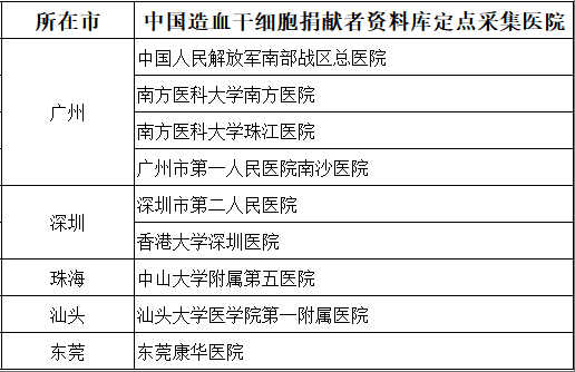 中国造血干细胞捐献者资料库定点采集医院信息表(广东)