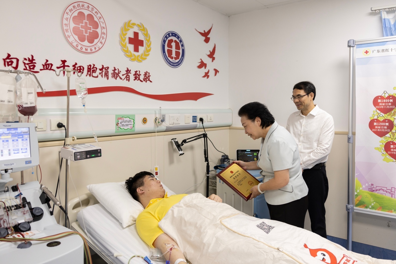 揭牌仪式后,与会人员前往血液科采集室,慰问了正在捐献造血干细胞的“00后”广州小伙陈先生,并为其颁发捐献造血干细胞荣誉证书,感谢他挽救生命的大爱善举。陈先生是中华骨髓库第21097例、广东省第2481例、广州市第472例捐献者。谈及捐献初心,他表示,3年前在学校献血时,听志愿者介绍中华骨髓库后便登记入库,“当时想着试一试,万一可以救人呢”。这份善意在3年后有了回响。今年6月,陈先生接到中华骨髓库广东分库的匹配电话,他毫不犹豫便同意捐献。他坦言:“能以这种方式救人感到很自豪,希望自己的造血干细胞能帮助患者战胜病魔。”