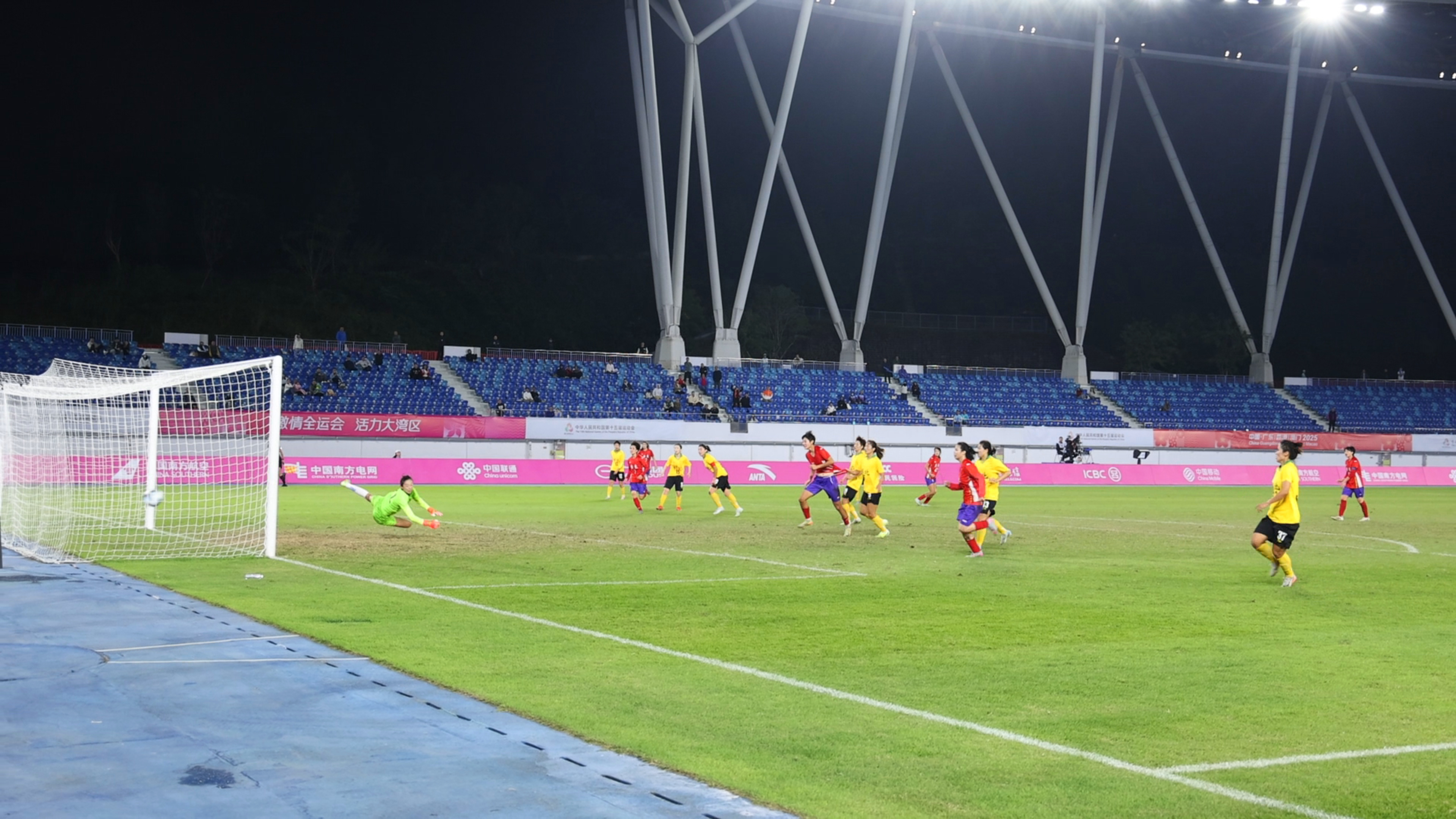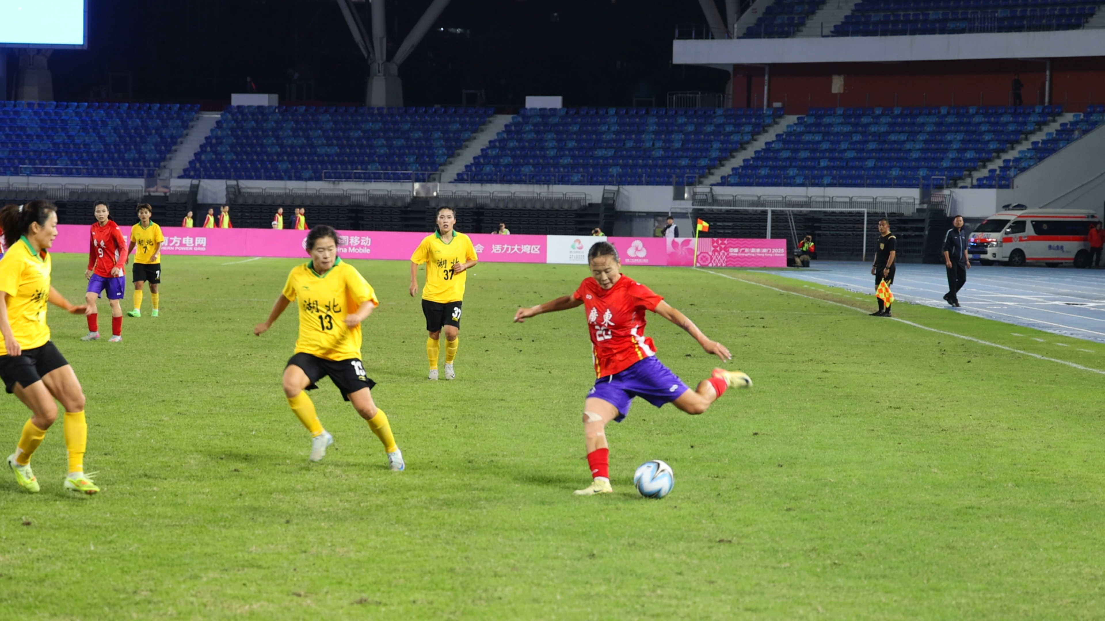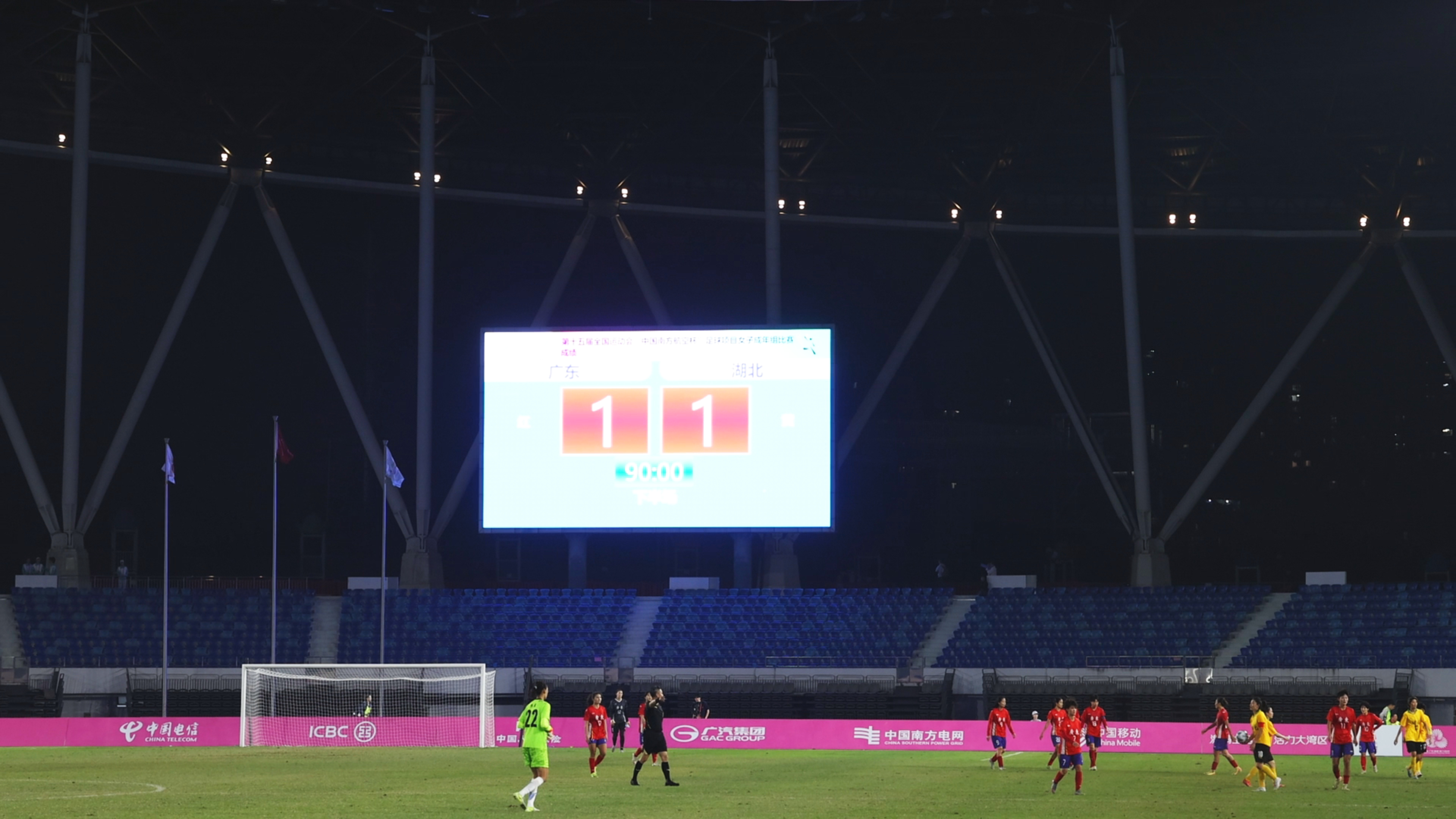 易边再战,湖北队率先打破僵局。第63分钟,替补登场的姜晨璟抓住进攻机会完成破门,帮助球队1:0取得领先。落后的广东队随即加强攻势,第83分钟,陈秀冰挺身而出完成进球,将比分扳为1:1平。此后双方互有攻守、对抗激烈,快速的攻防转换引得现场观众惊呼连连,尽管两队均创造出数次破门良机,但1:1的比分始终未能改写,比赛按赛制直接进入点球大战。
