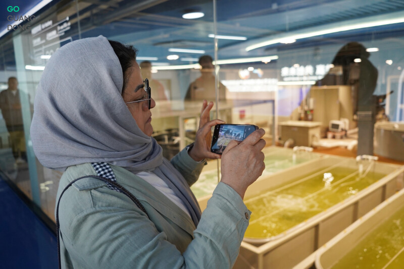 伊朗驻华大使馆参赞Reza Pirpiran夫人Shirin Pirpiran在中国(珠海)白蕉海鲈产业示范园种苗繁育车间前认真拍照记录。