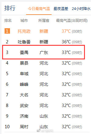 而对于内陆地市,气温持续升高。如受南海热带低压影响,在上午9时,番禺进入全国高温榜前三。
