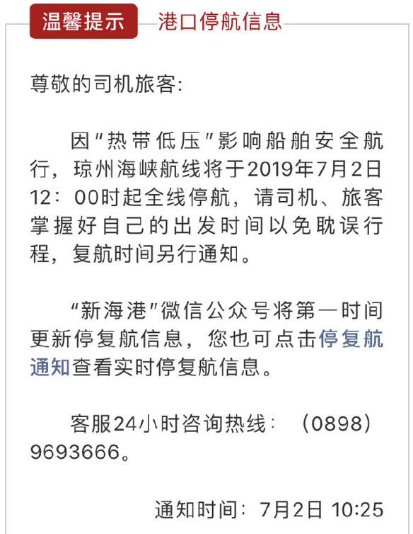截至11时30分,包括湛江、阳江、茂名等多个地市发布台风预警。受热带低压影响,琼州海峡航线于7月2日12时起全线停航。