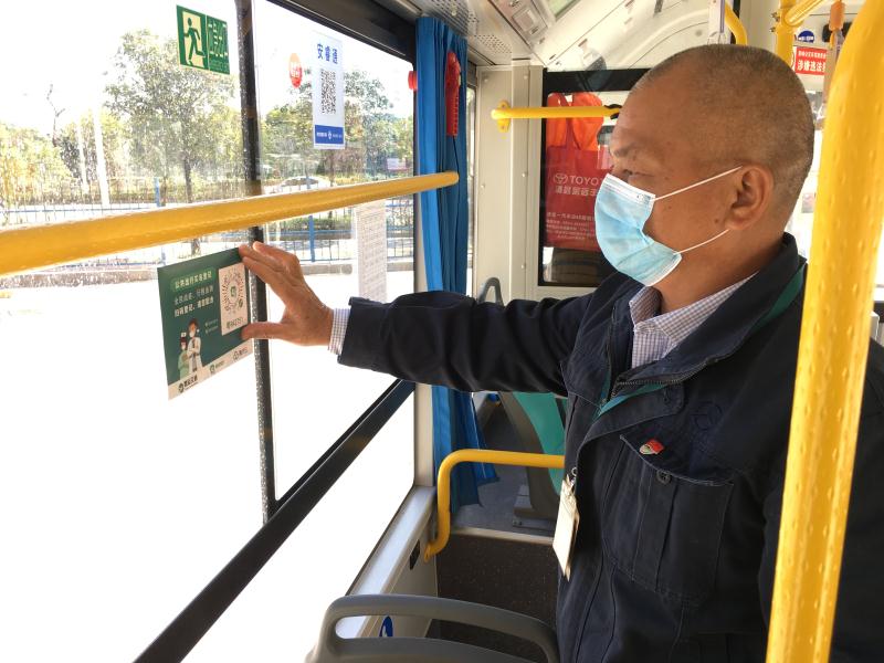 清远粤运司机黄玉培正在公交车上粘贴“公共出行实名登记”二维码