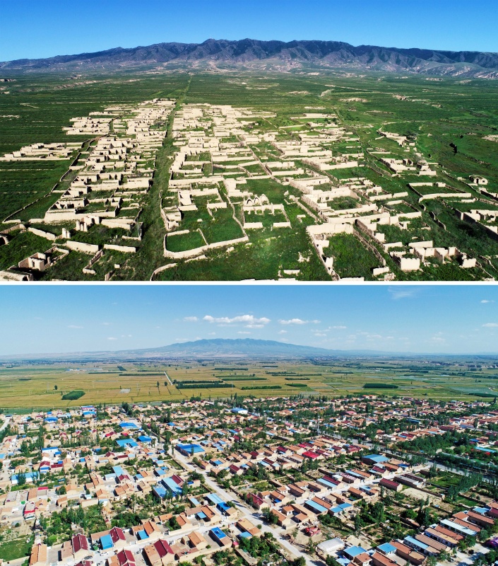 上图为经过近20年的生态修复,宁夏吴忠市红寺堡区新庄集乡移民旧址已逐渐被绿色覆盖;下图为戈壁荒滩上建起的红寺堡移民新村。