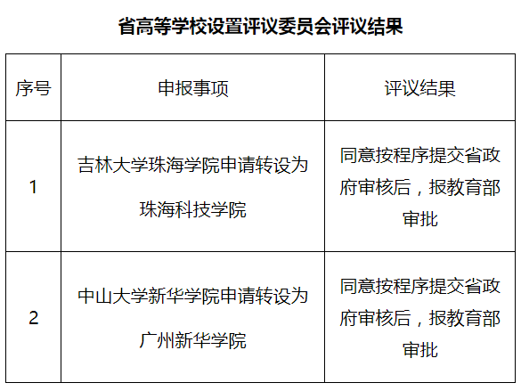 今天(9日),广东省教育厅公布《关于省高等学校设置评议委员会评议结果的公示》,经省高等学校设置评议委员会专家考察和评议,同意按程序将吉林大学珠海学院转设为珠海科技学院、中山大学新华学院转设为广州新华学院的申报材料报请省政府审核后,报教育部审批。