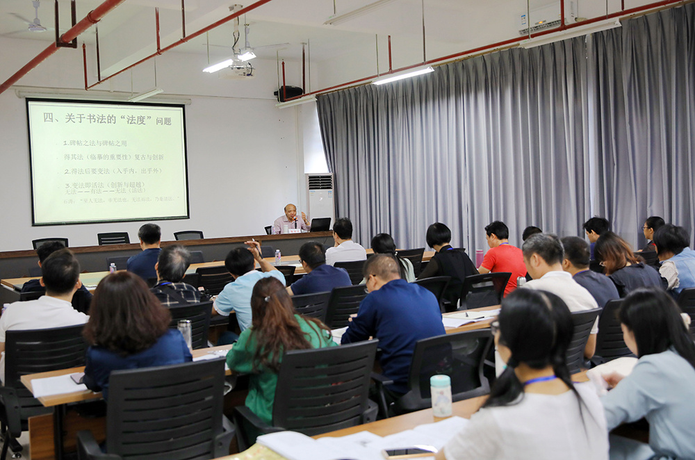 “中国书法最早是从实用到审美,再到生活方式。”暨南大学原党委书记、博士生导师、文艺批评家蒋述卓教授受邀为学员开讲“双创”视野下的中国书法。他认为,中国书法是通过笔墨点画来创造审美意象的空间艺术,他分析了关于书法中的气韵生动、法度、变化与统一等问题,阐释了融媒体视角中的书法创新和关于现代书法的现象。蒋述卓强调,要推进书法教育与素质教育的创新发展,让书法教育起到操正步、突重点、强素质、调心理、育人格的作用。