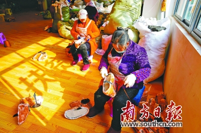 昭通市盐津县水田新区异地扶贫搬迁安置点扶贫车间,工人正在生产鞋子。 南方日报见习记者 许舒智 摄