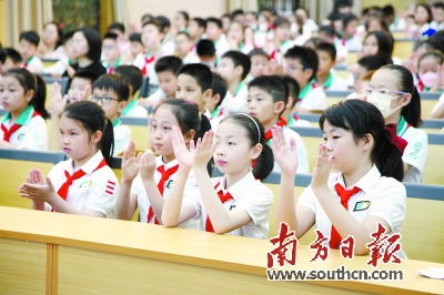 百个革命遗址蹲点记者进校园巡讲,广州市越秀区东风东路小学学生积极参与课堂互动。南方日报见习记者 姚昱旸 摄